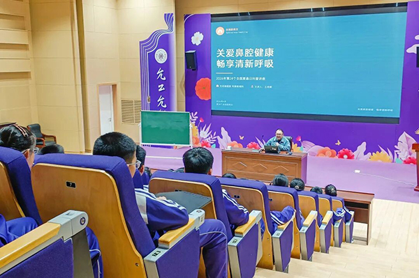 活动当天,耳鼻喉科王忠毅医师结合青少年鼻腔发育特点与常见健康问题,以生动通俗的语言、直观的图片和趣味动画,深入浅出地讲解了鼻子在呼吸、过滤、嗅觉、加温加湿等方面的重要功能,帮助学生建立科学的鼻腔健康认知。讲座重点围绕过敏性鼻炎、慢性鼻窦炎、鼻中隔偏曲、鼻出血等青少年高发鼻部疾病,详细剖析了发病原因、典型症状及潜在危害,并针对春季花粉、粉尘、冷空气等常见诱因,提供了实用的预防建议、科学的护鼻方法及应急处理技巧。