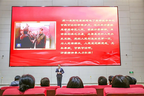 本次活动特别邀请山东临沂市委党校教师,以情景剧为载体,生动展现了在党领导中国人民革命、社会主义建设、改革开放和新时代的各个历史时期中,一代代沂蒙人民用牺牲与奉献铸就的伟大沂蒙精神。党课沿着清晰的历史脉络,分为《党群心连心》《拥军勇支前之沂蒙母亲》《日月换新天》《时代谱新篇》四个篇章,将沂蒙革命老区的光辉历程娓娓道来。